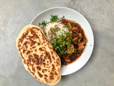 In der Zwischenzeit den Naan Teig zubereiten. Alle trockenen Zutaten in einer kleinen Schüssel vermischen. Butter und Milch gemeinsam vorsichtig erwärmen. Wenn die Butter geschmolzen ist, vom Herd nehmen und einige Minuten abkühlen lassen. Joghurt in eine größere Rührschüssel geben, Butter-Milch-Gemisch langsam einrühren. Es soll eine homogene Masse entstehen. Jetzt die Mehlmischung mit einem Kochlöffel langsam unterheben. Sobald sich alles halbwegs verbunden hat, auf der Arbeitsfläche weiterarbeiten. Den Teig nun unter Zugabe von weiterem Mehl (nach Bedarf, bei mir war es schon einiges) verkneten, bis eine geschmeidige Kugel entstanden ist. Am Anfang eine eher klebrige Geschichte, aber das wird.