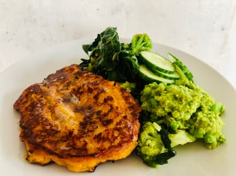 Die gekochten, ausgedampften Süßkartoffeln in einer Schüssel gut zerstampfen, mit 1-2 TL Paprikapulver, 1 TL Kurkuma, etwas Chili, Salz und frisch gemahlenem Pfeffer würzen.