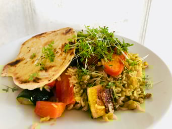 Wenn die Mungbohnen und der Reis gar sind, das Gewürzmasala unterrühren, Gemüse und Zitronensaft unterheben, mit Salz und Pfeffer abschmecken und mit Kresse und Fladenbrot servieren. Optional passt auch Naturjoghurt sehr gut dazu.